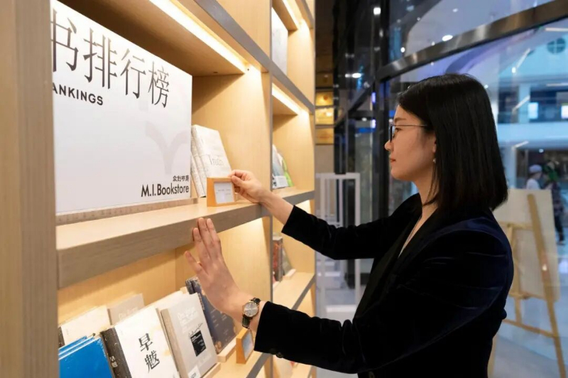 于冰在摆放书店入口处所陈列图书的推荐语标签。新华社记者谢剑飞 摄