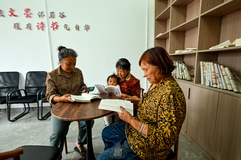 村民们在新时代文明实践站内阅读。