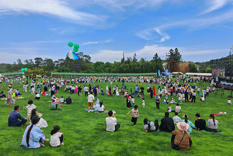 游客在景区草坪休憩。