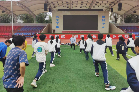 射洪中学将阳光体育融入校园文化建设,图为11月2日射洪中学体育教师余文龙带领学生做热身运动。新华网 李然 摄