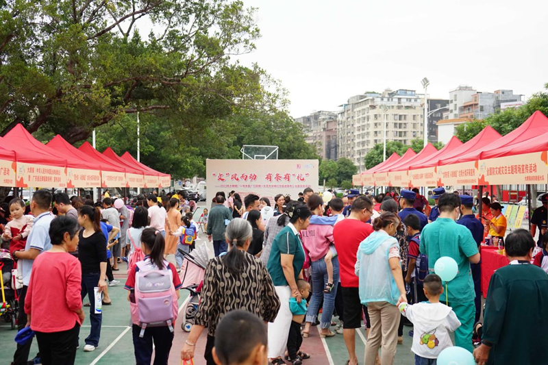 2023年5月10日,东莞市大朗镇新时代文明实践中心联动各文明委成员单位,在水平村篮球场开展“一号关爱”行动暨《东莞市文明行为促进条例》主题宣传活动。(东莞市文明办供图)