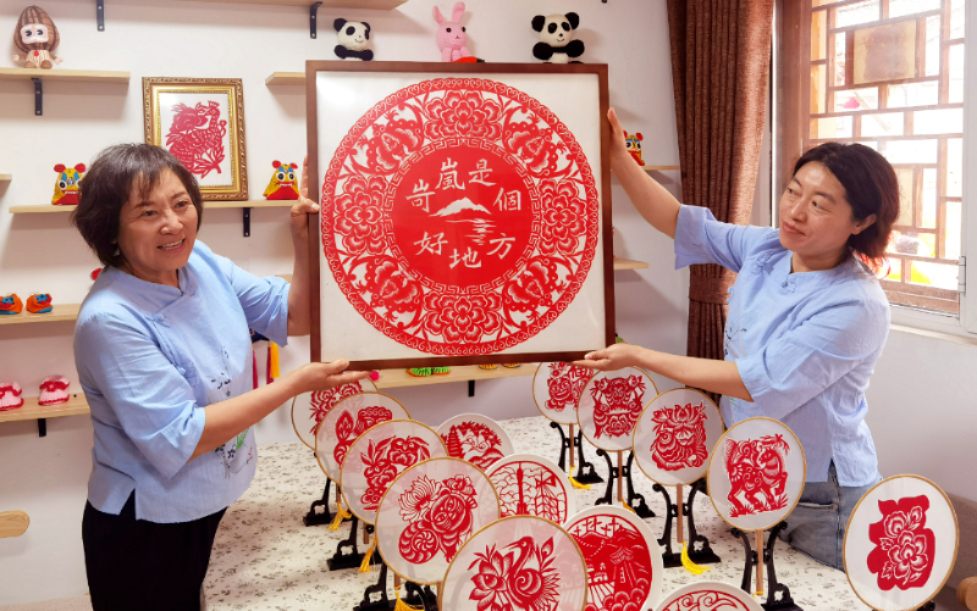 8月8日,忻州市民间工艺美术大师、非物质文化遗产传承人韦东梅与工作人员现场展示剪纸作品。新华网 任钰 摄