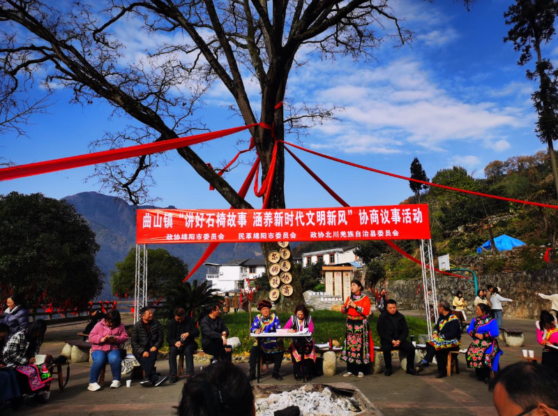 北川县曲山镇石椅村在皂角树下开展“讲好石椅故事 涵养新时代文明新风”协商议事活动。新华网发(北川县委宣传部供图)