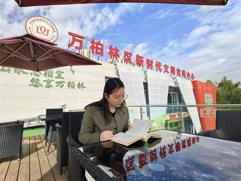 万柏林区新时代文明实践中心城市书房二层露台的读者。王露 摄