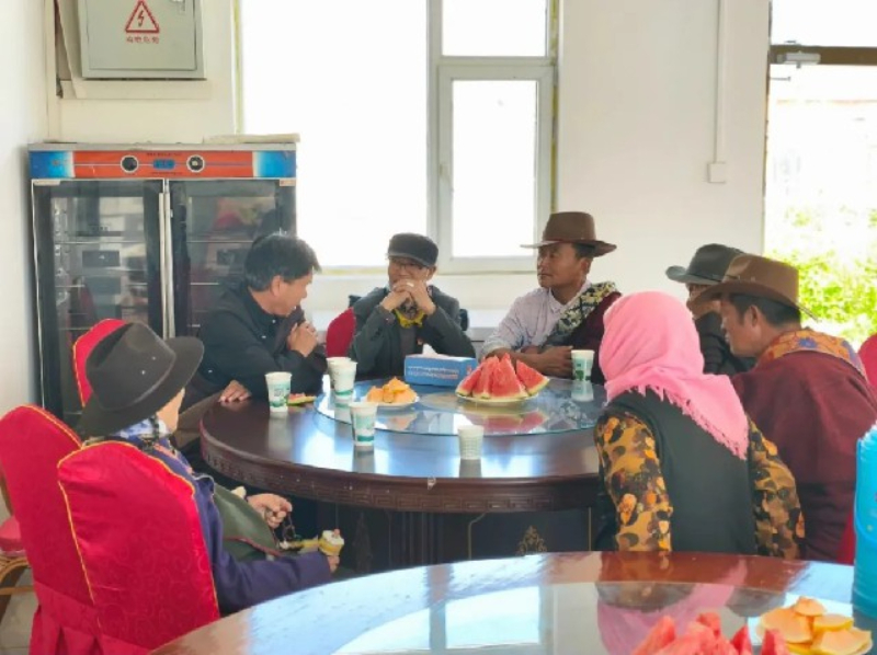 盛夏正午,高原的阳光热辣滚烫,海北藏族自治州海晏县青海湖乡达玉五谷村的幸福食堂内却一片凉爽,村里的老人们围坐在餐桌旁边吃饭边唠家常,享受悠闲时光。