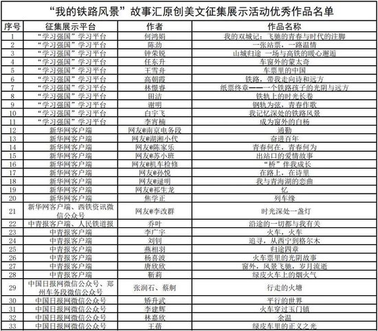 打印:12月30日,由中宣部文明创建局、中央网信办网络传播局、中国作协创联部、中国国家铁路集团有限公司党组宣传部联合举办的“我的铁路风景”故事汇原创美文征集展示活动优秀作品名单公布,共252件。