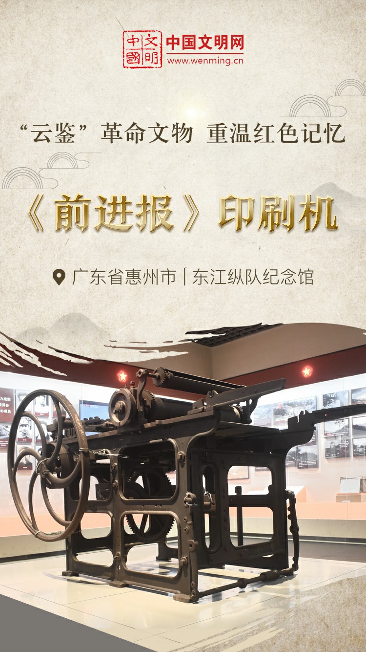革命文物,承载党和人民英勇奋斗的光荣历史,是弘扬革命传统和革命文化、加强社会主义精神文明建设、激发爱国热情、振奋民族精神的生动教材。中国文明网“文明之声·云鉴馆藏”专栏邀您走进各地革命博物馆、纪念馆、党史馆等红色主题场馆,一起“打卡”红色地标,“云鉴”红色馆藏,汲取奋进力量。今天为您介绍东江纵队纪念馆的馆藏文物——《前进报》印刷机。
