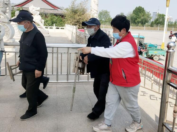 志愿者搀扶老人进入景区